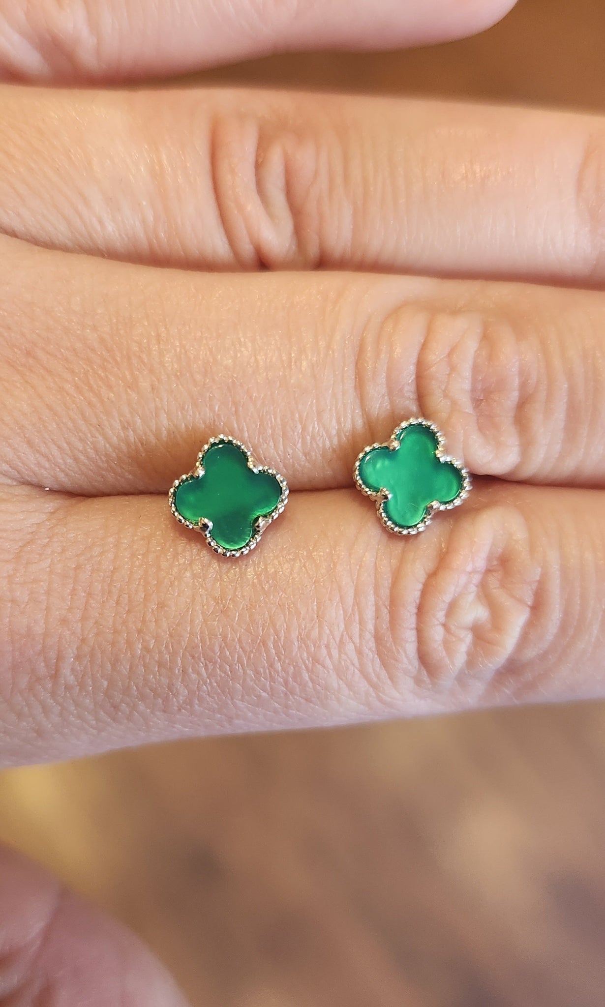 Elevate your style with our exquisite sterling silver green clover stud earrings. These fashionable earrings feature a delicate green clover design, secured with screw backs. The perfect choice for adding a touch of sophistication to any outfit. Make a statement and shine with these exclusive earrings.