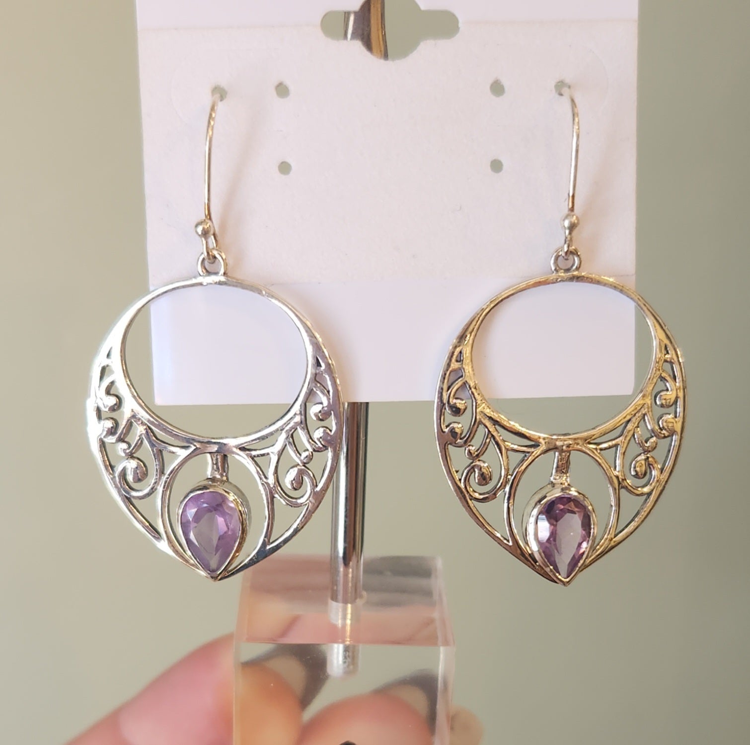 Stunning dangle earrings featuring natural amethysts set in delicate sterling silver filigree.