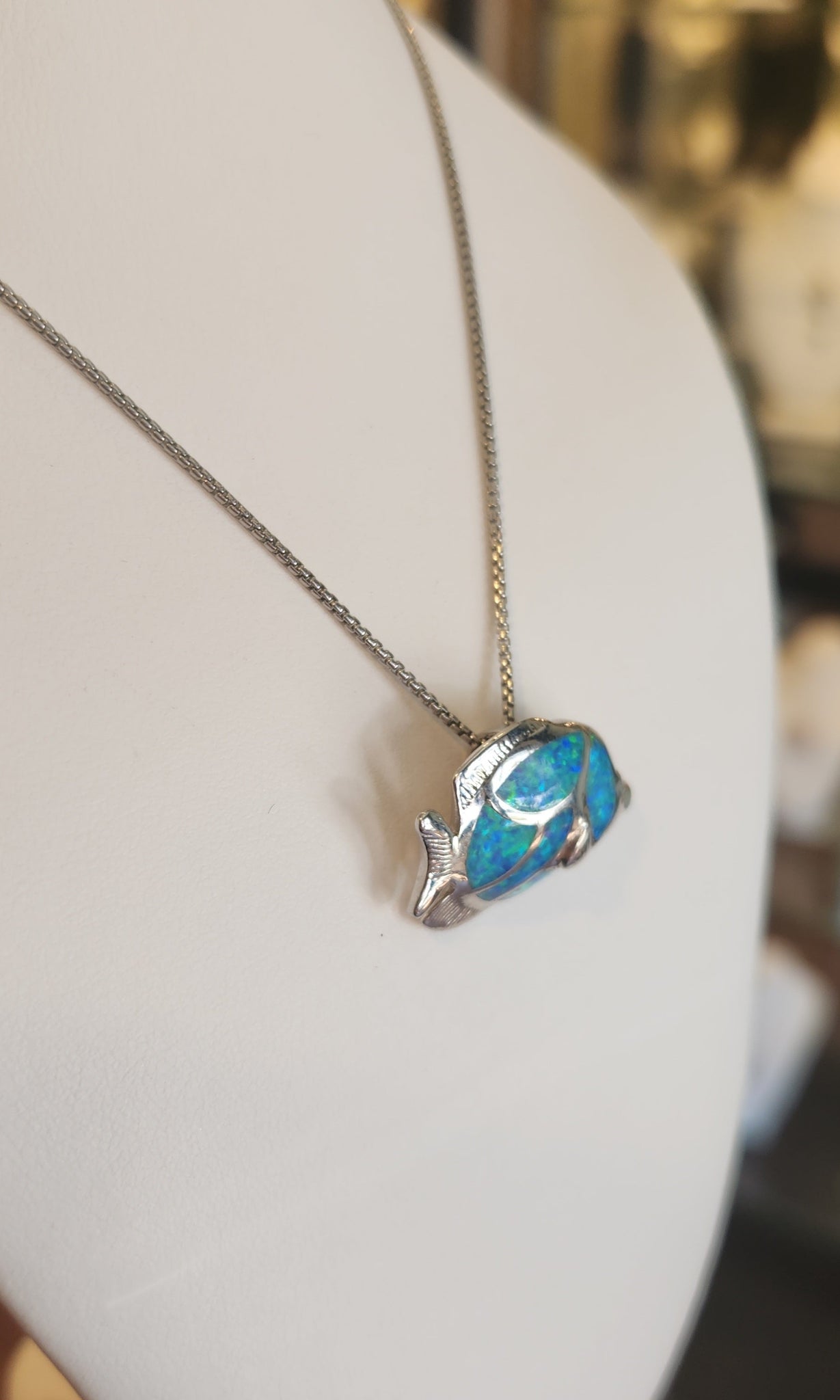 Swimming with style, this sterling silver pendant features a beautiful inlay of Kyocera opal, creating a...