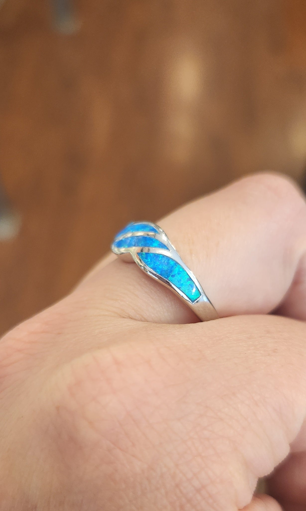 This sterling silver ring features a unique inlay of kyocera opal, creating a wavy pattern that catches the light in a playful way. Look effortlessly stylish and add a touch of whimsy to any outfit with this quirky statement piece.