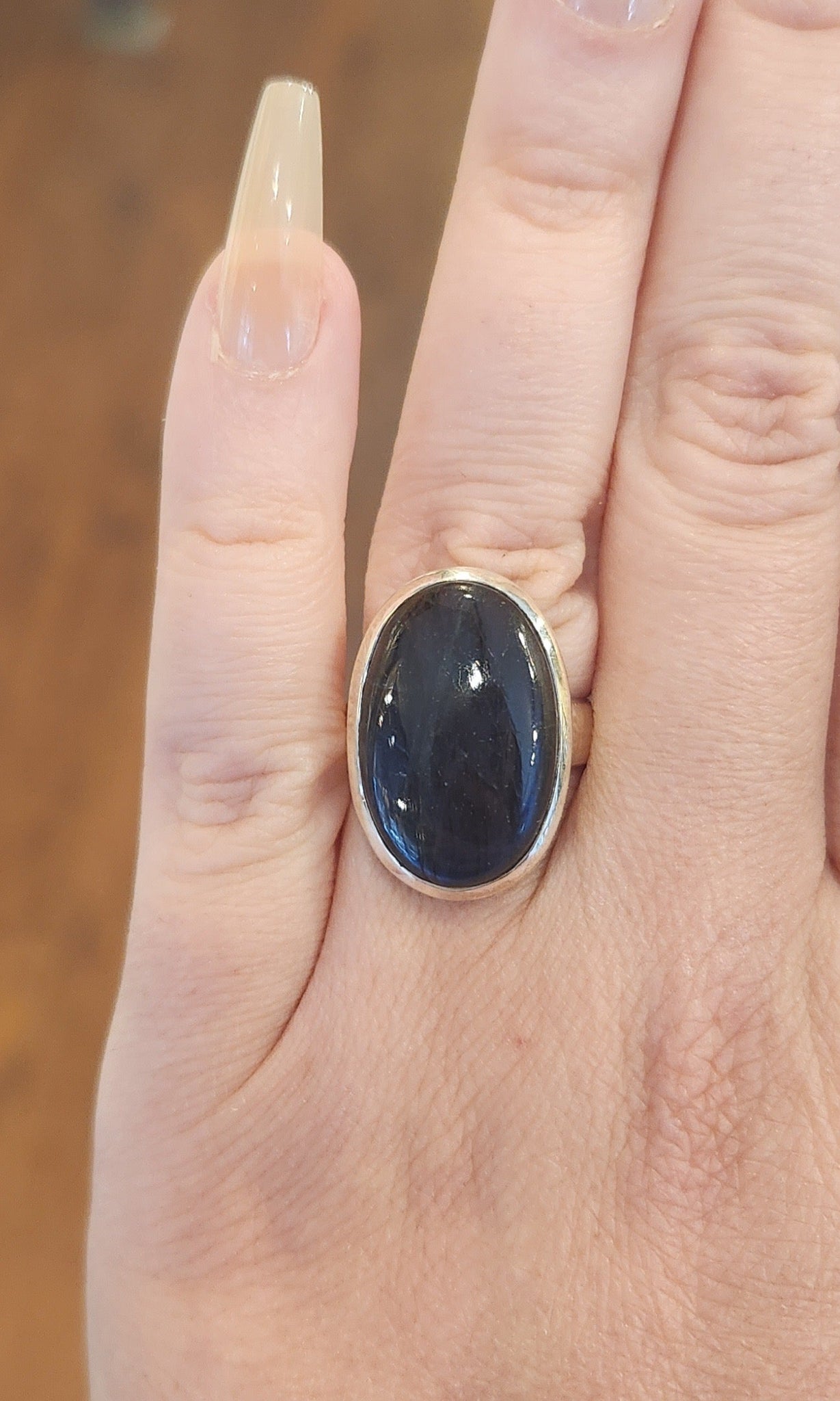 Expertly crafted sterling silver ring featuring a mesmerizing natural oval blue labradorite cabochon. Elevate any outfit with this unique and elegant piece, perfect for any occasion. Enjoy the iridescent hues and positive energy this ring brings.