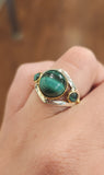 Beautiful and unique sterling silver ring featuring three natural malachite cabochons and brass highlights.