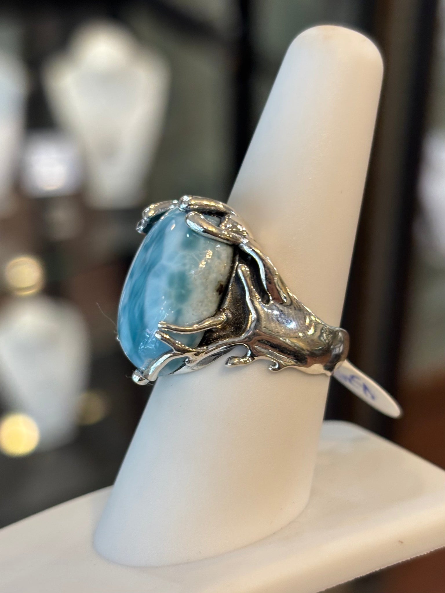 Expertly crafted from sterling silver, this unique cocktail ring showcases a gorgeous Larimar stone with a distinctive design and substantial oval band. The handcrafted silver pieces delicately encase the stone, creating a one-of-a-kind piece. Elevate any outfit with this beautiful and statement-making ring.