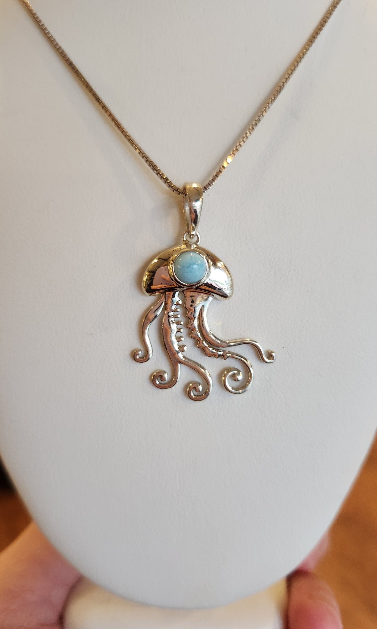 Very cute sterling silver jellyfish pendant featuring a round larimar cabochon. Chain included.ÃÂÃÂ