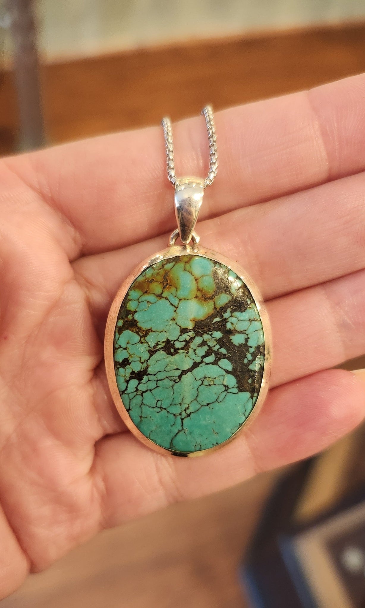 Stunning piece of natural turquoise set in a sterling silver bezel. Chain included.ÃÂÃÂ