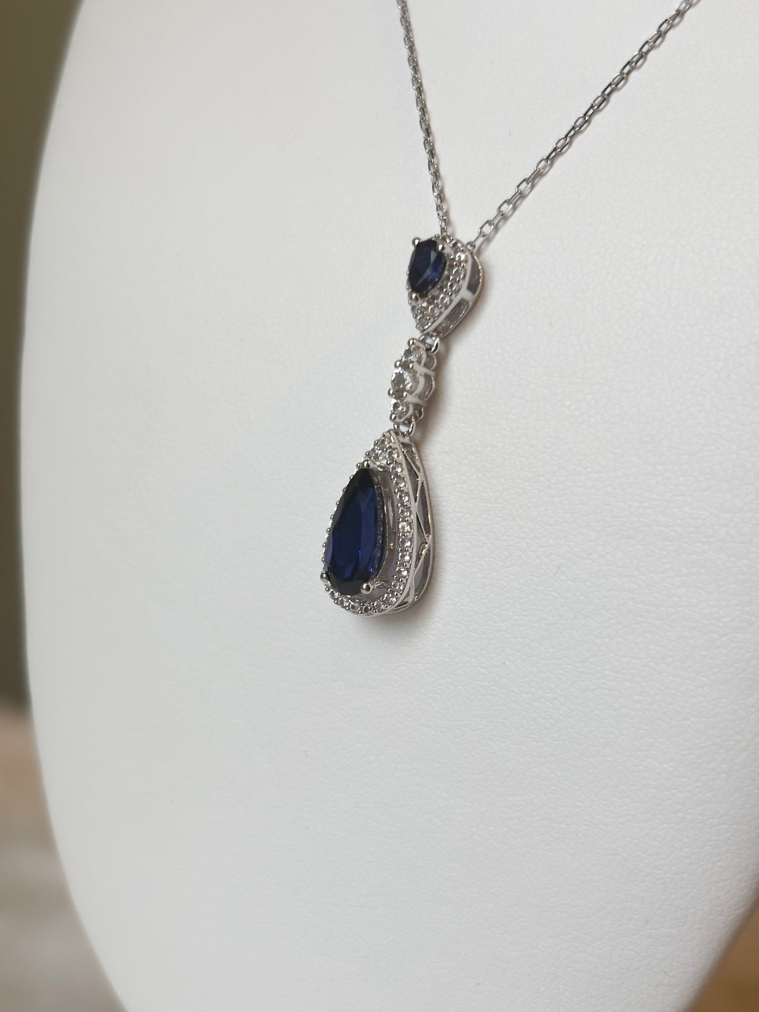 Sterling silver multi stone pear shaped blue sapphire halo pendant
