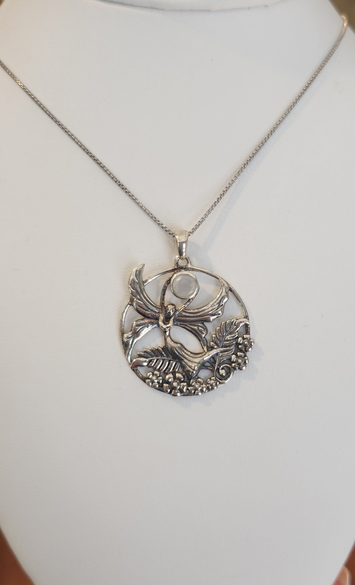 Gorgeous and mystical sterling silver pendant featuring a faery holding a rainbow moonstone cabochon. Chain included.