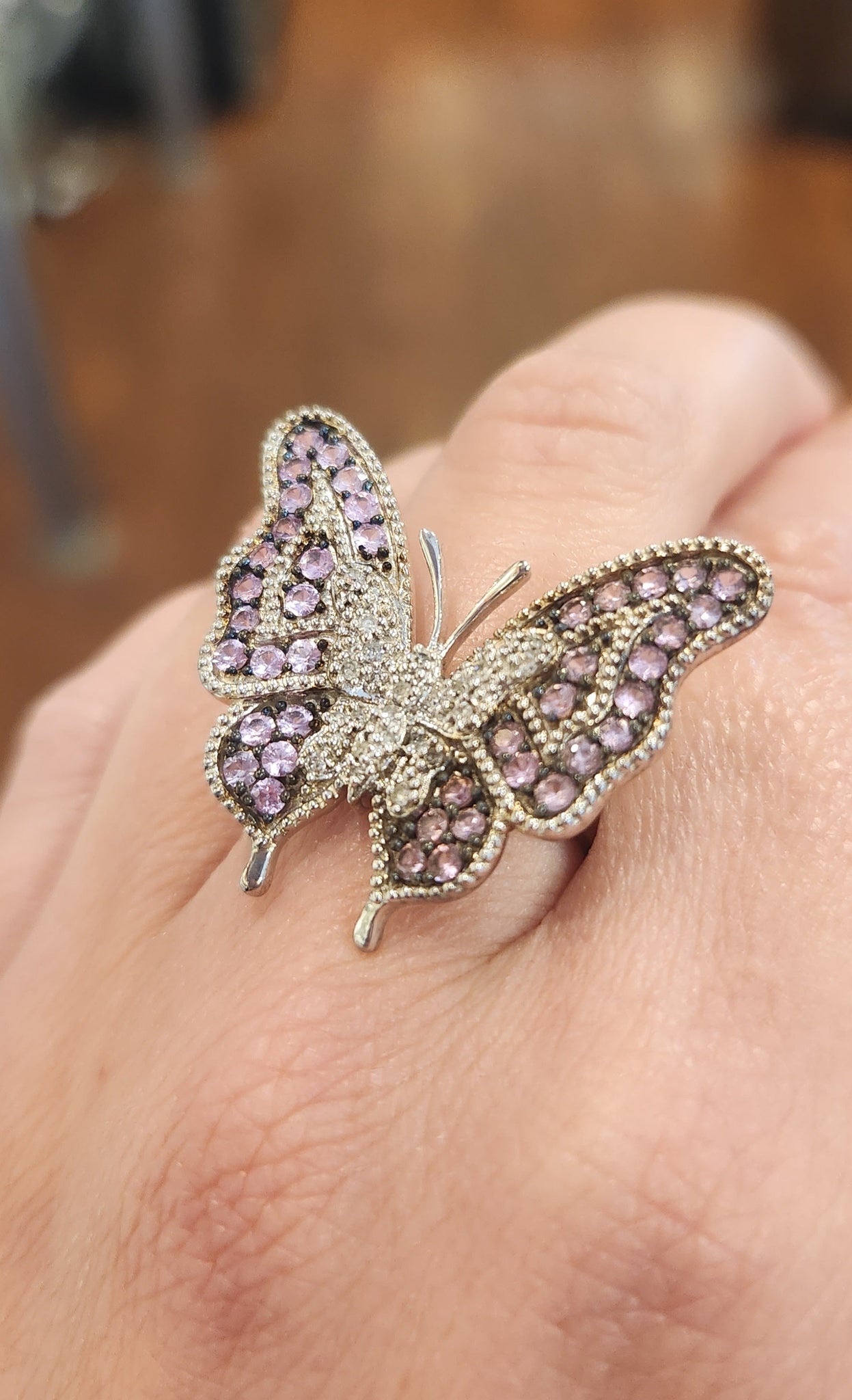 Beautiful sterling silver butterfly statement ring. Features several natural pink tourmaline gemstones. A must-have for any...