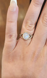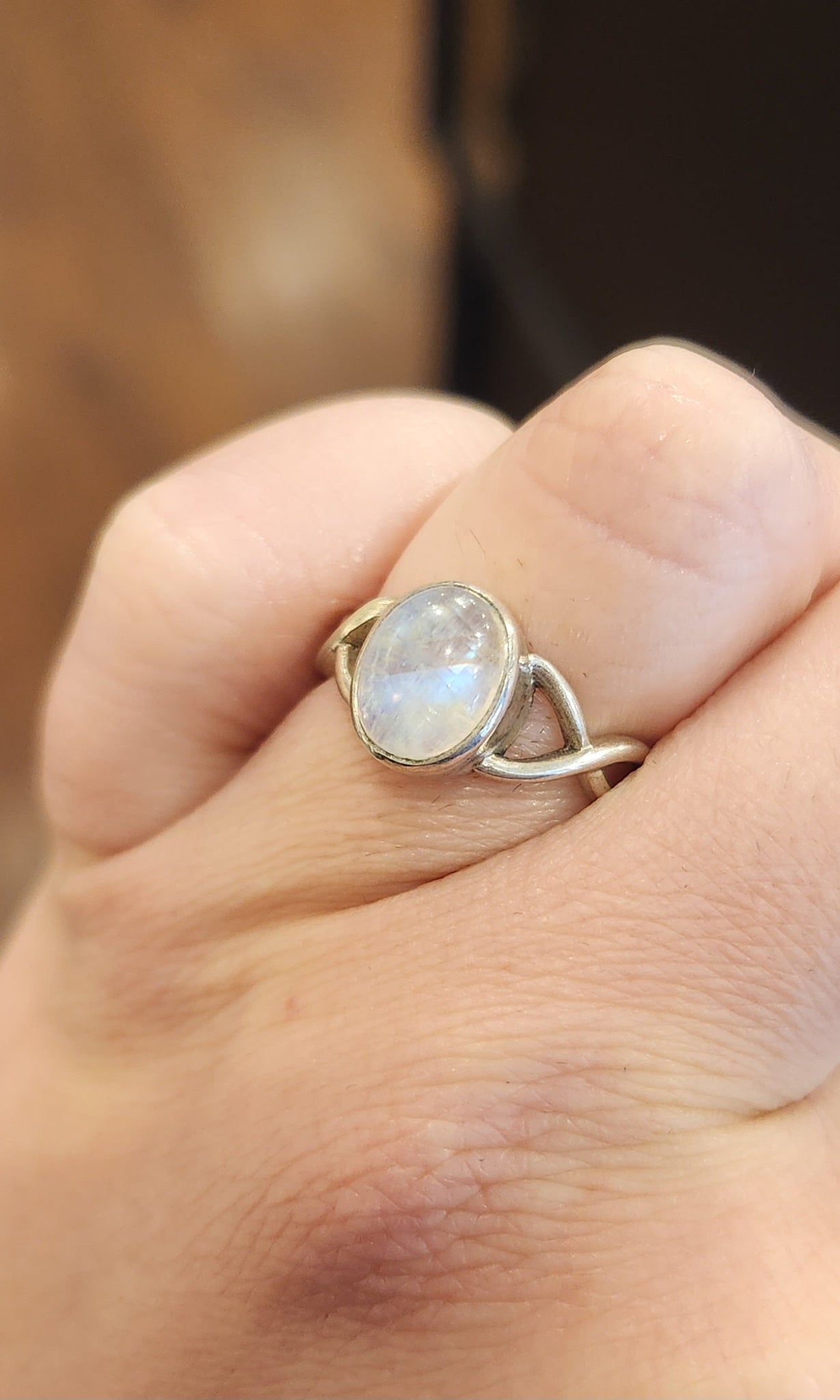 Unique sterling silver ring featuring a flashy rainbow moonstone cabochon atop a twisted band.