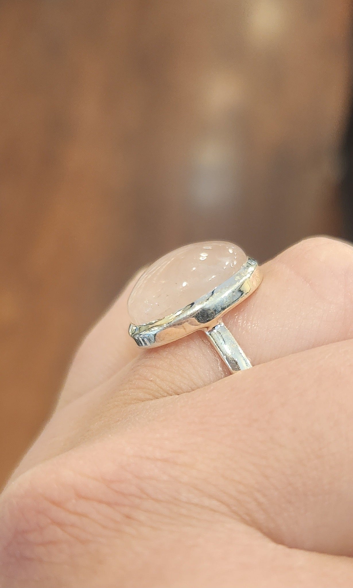 Expertly crafted from sterling silver, this ring features an eye-catching oval rose quartz cabochon. The soft pink hue of the gemstone is known to promote love and harmony, making this ring not only a beautiful accessory but also a potential source of positive energy in your everyday life.