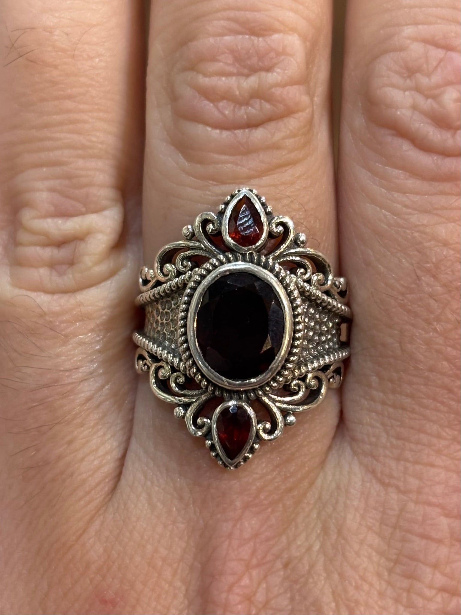 Make a striking impression with this sophisticated sterling silver statement ring. The oval garnet center stone commands attention, beautifully flanked by two delicate pear-shaped garnet accents that enhance its dramatic presence. Crafted with refined elegance, this three-stone design balances bold geometry with graceful proportions, creating a piece that transitions seamlessly from evening wear to elevated everyday styling.ÃÂÃÂ