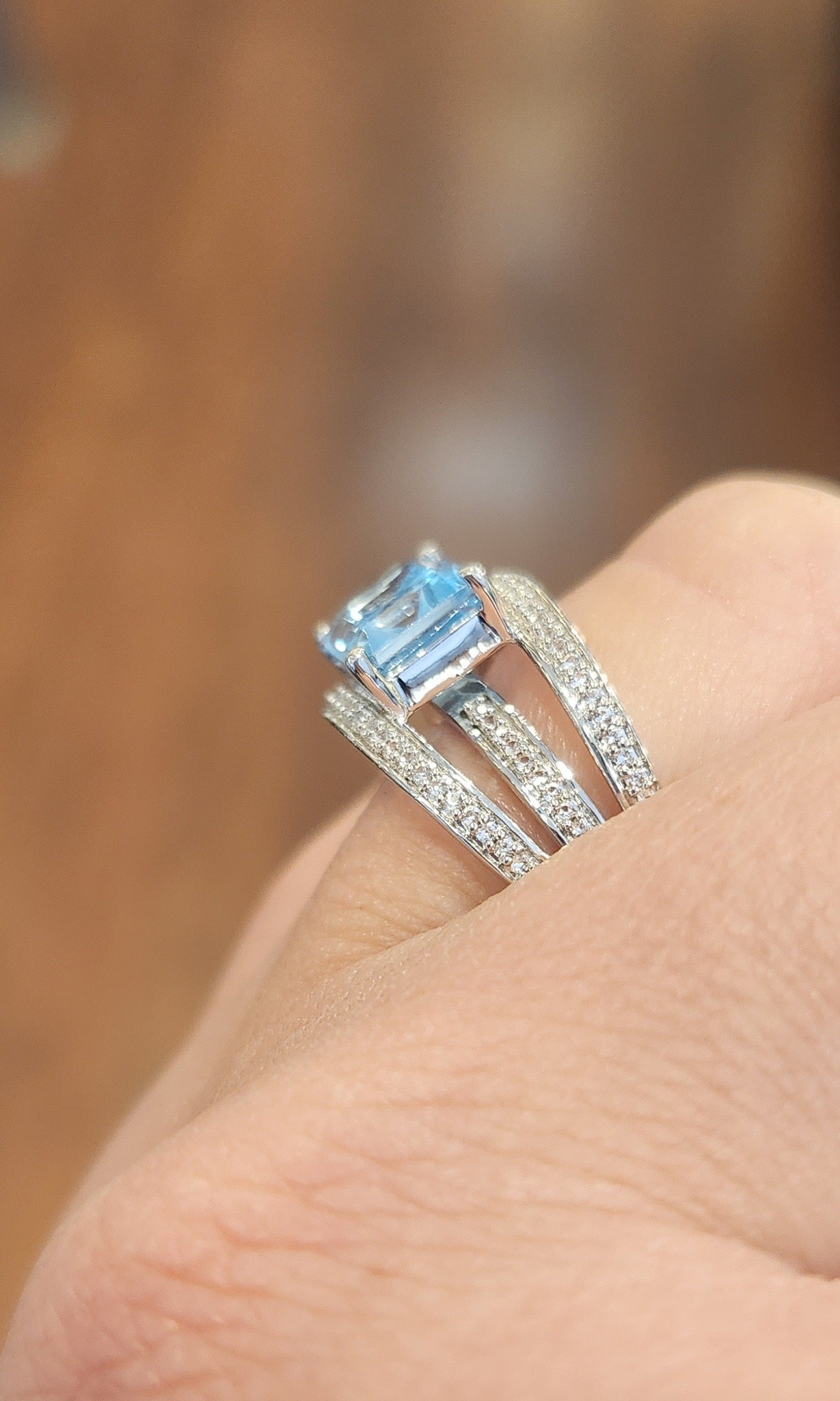 This expertly crafted Sterling silver ring features a sideways rectangle blue topaz gemstone, accented with sparkling diamonds on the triple band design. Elevate your style with this unique and elegant piece, perfect for any occasion.