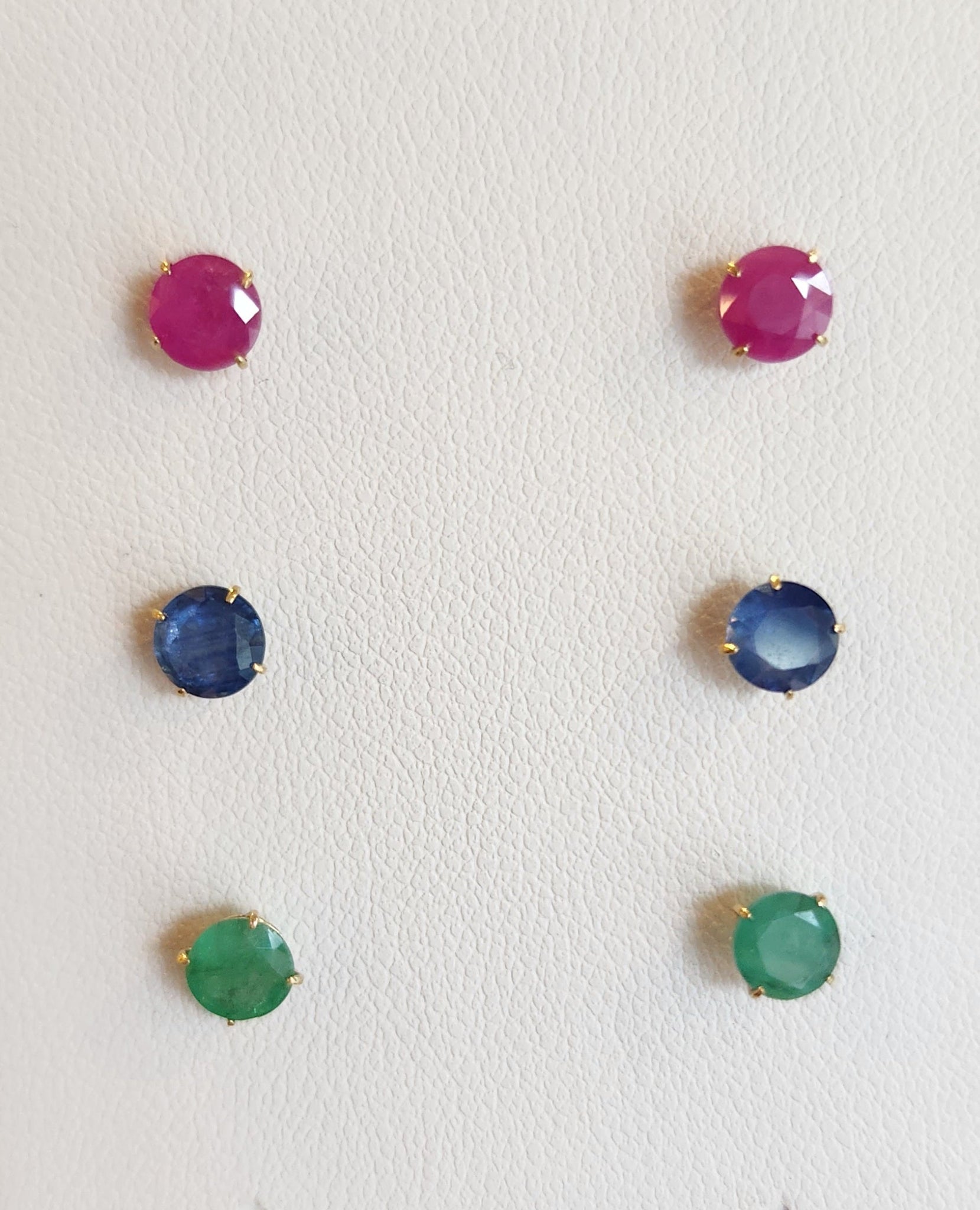 14k yellow gold precious gemstone studs available in natural emerald, ruby or sapphire. Stone is round and measures 4mm.