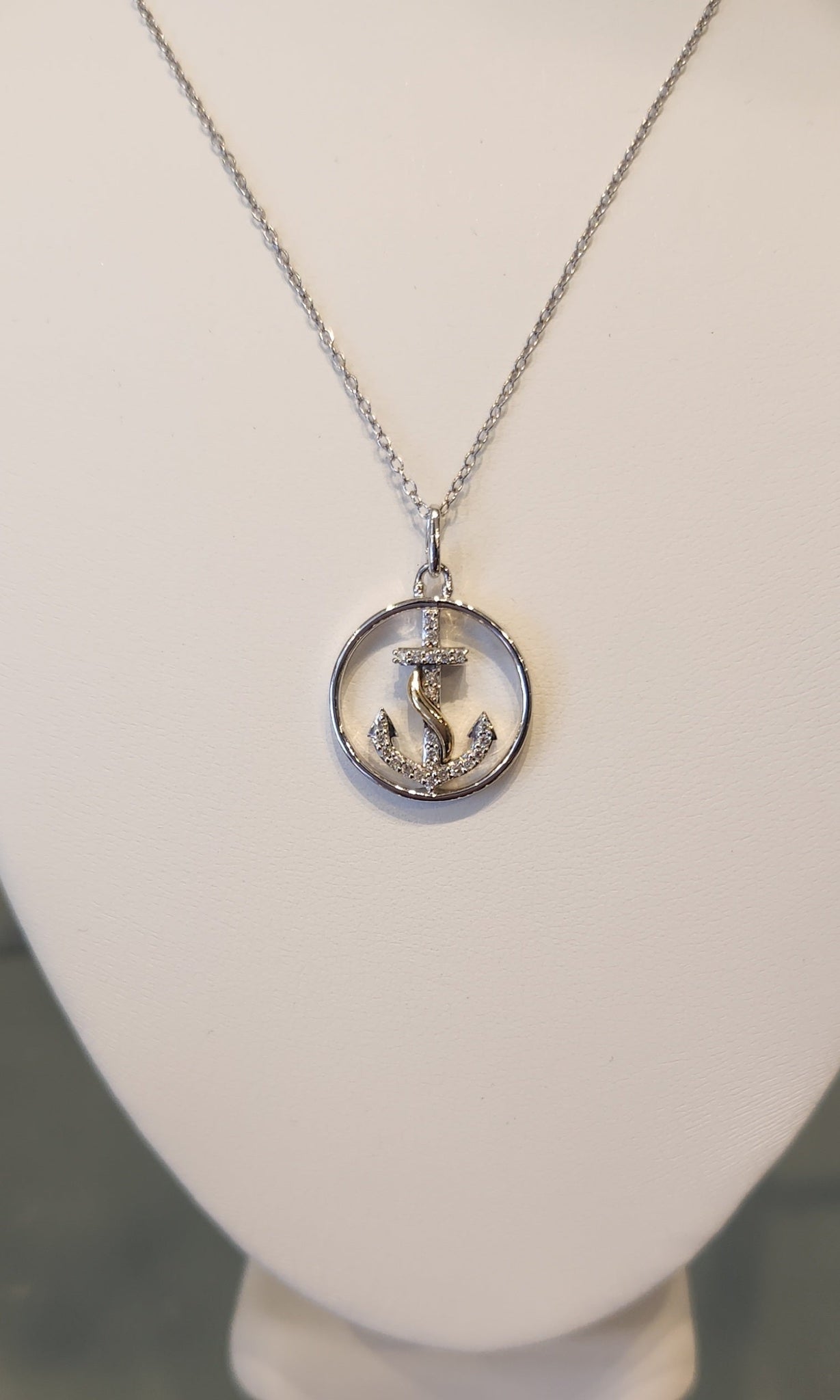 Sterling silver anchor pendant with gold accent and diamonds