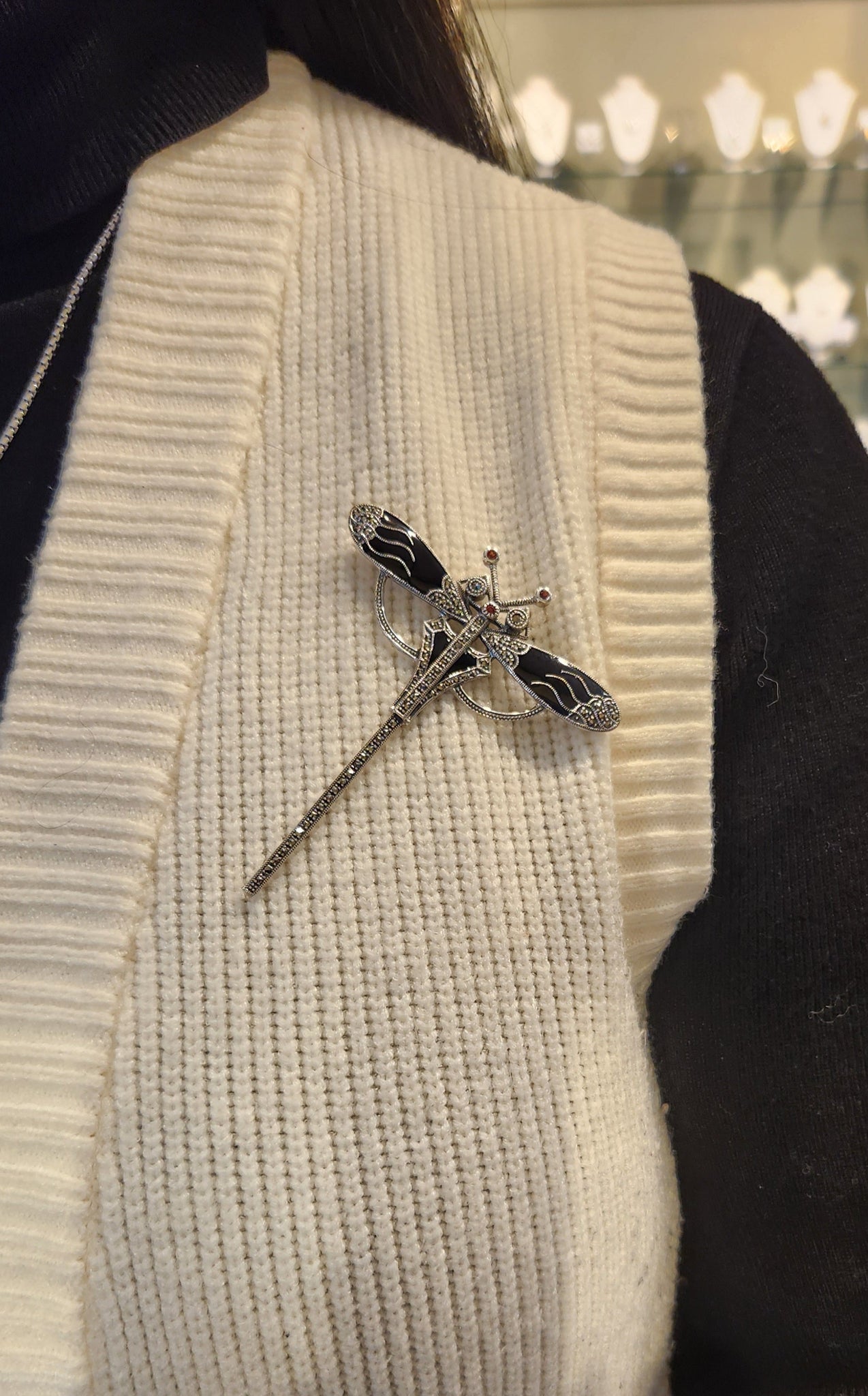 Stunning sterling silver dragonfly brooch featuring black enamel, marcasite eyes, and natural garnets. This item is part of our Art Deco reproduction line.