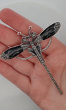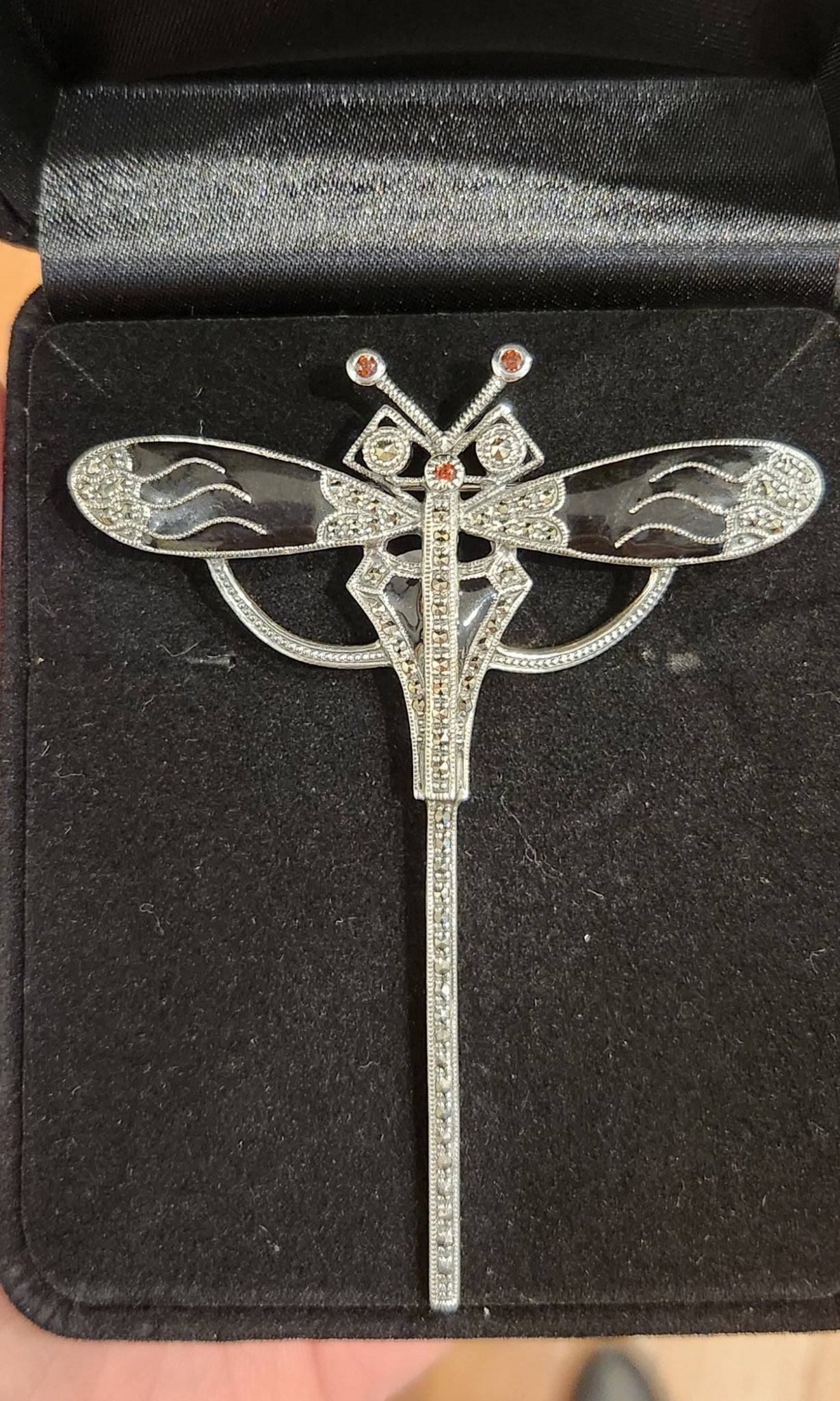 Stunning sterling silver dragonfly brooch featuring black enamel, marcasite eyes, and natural garnets. This item is...