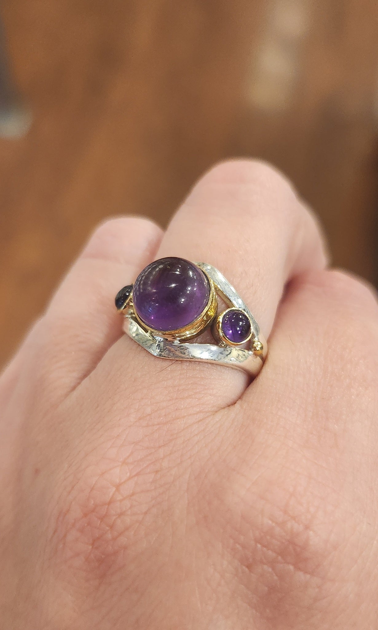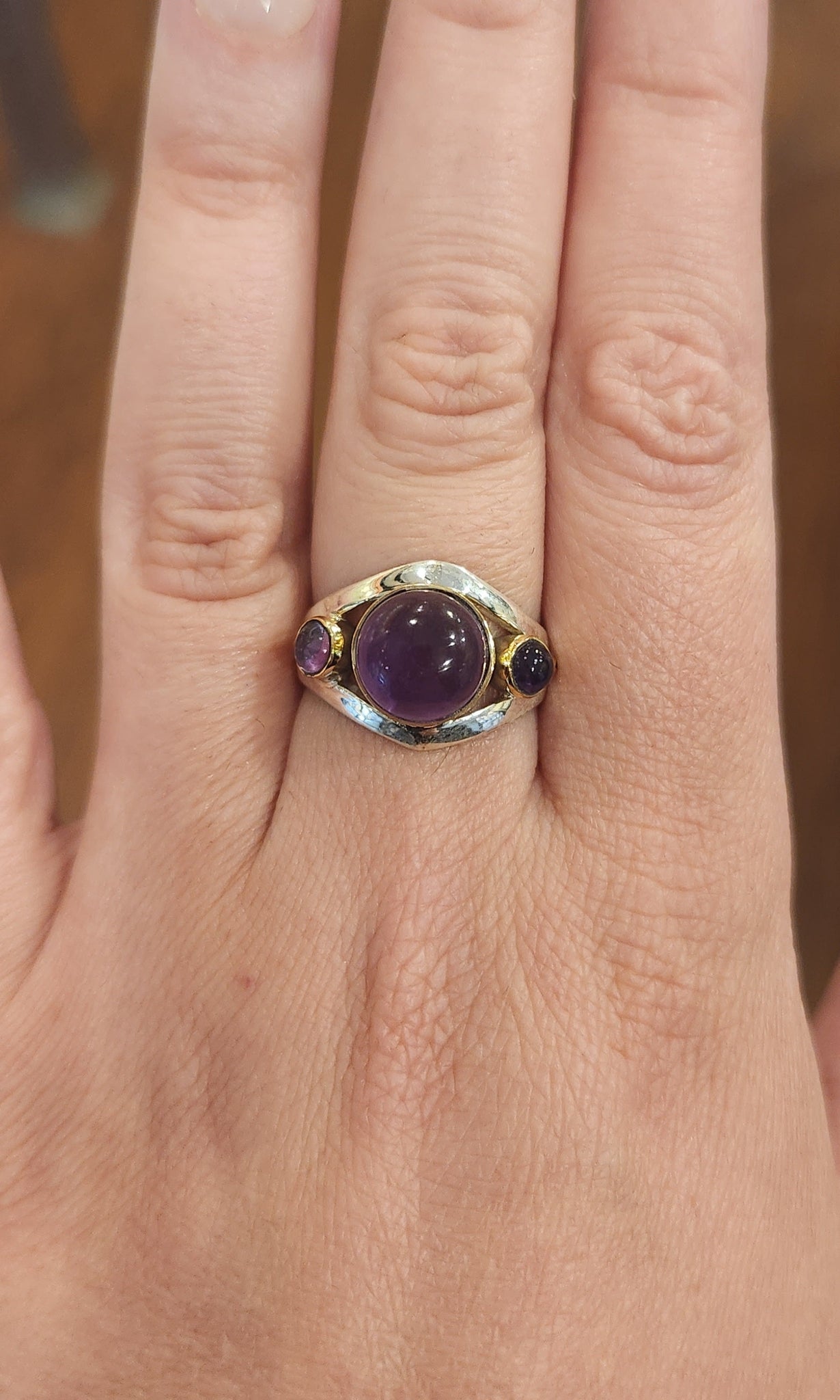 Beautiful and unique sterling silver ring featuring three natural amethyst cabochons and brass highlights.